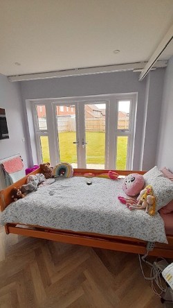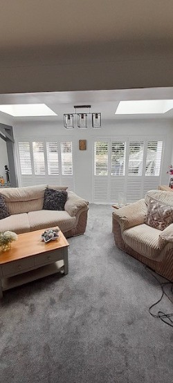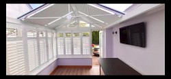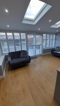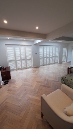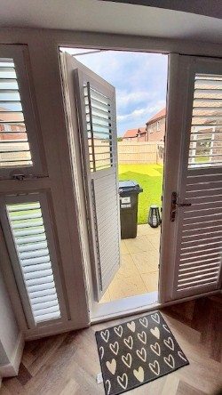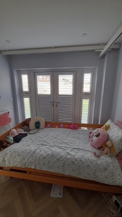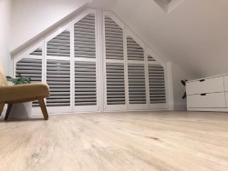 Tracked shutters are ideal for covering much larger areas such Patio or French Doors. Multiple panels fold back on each on a track at the top and optionally at the bottom too. Can also be used as a room divider.